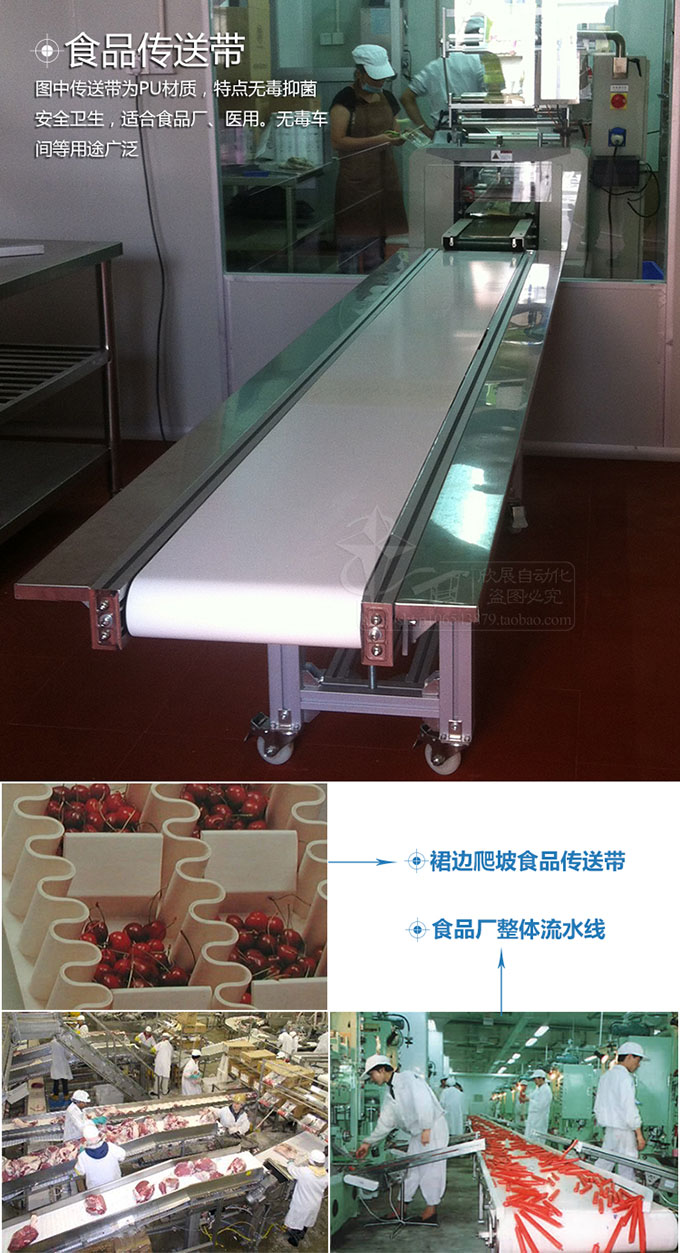 主图PU无毒传送带为展示图,(不含两边工作台报价,以上报价提供参考,具体报价需要咨询客服.)有普通输送带和挡板输送带因为一般每个厂商需要的尺寸和规格都不同,所以传送带都是非标生产,不同的皮带材质和带宽;不同的机身长度和高度;可添加不同的辅助设备。如添加防尘罩、散热风扇,添加工作台,灯架。看商家的需要求来定。传送带有折叠款的,不用时可以折叠起来不占用空间。如果亲有需要或有疑问可以直接咨询客服。